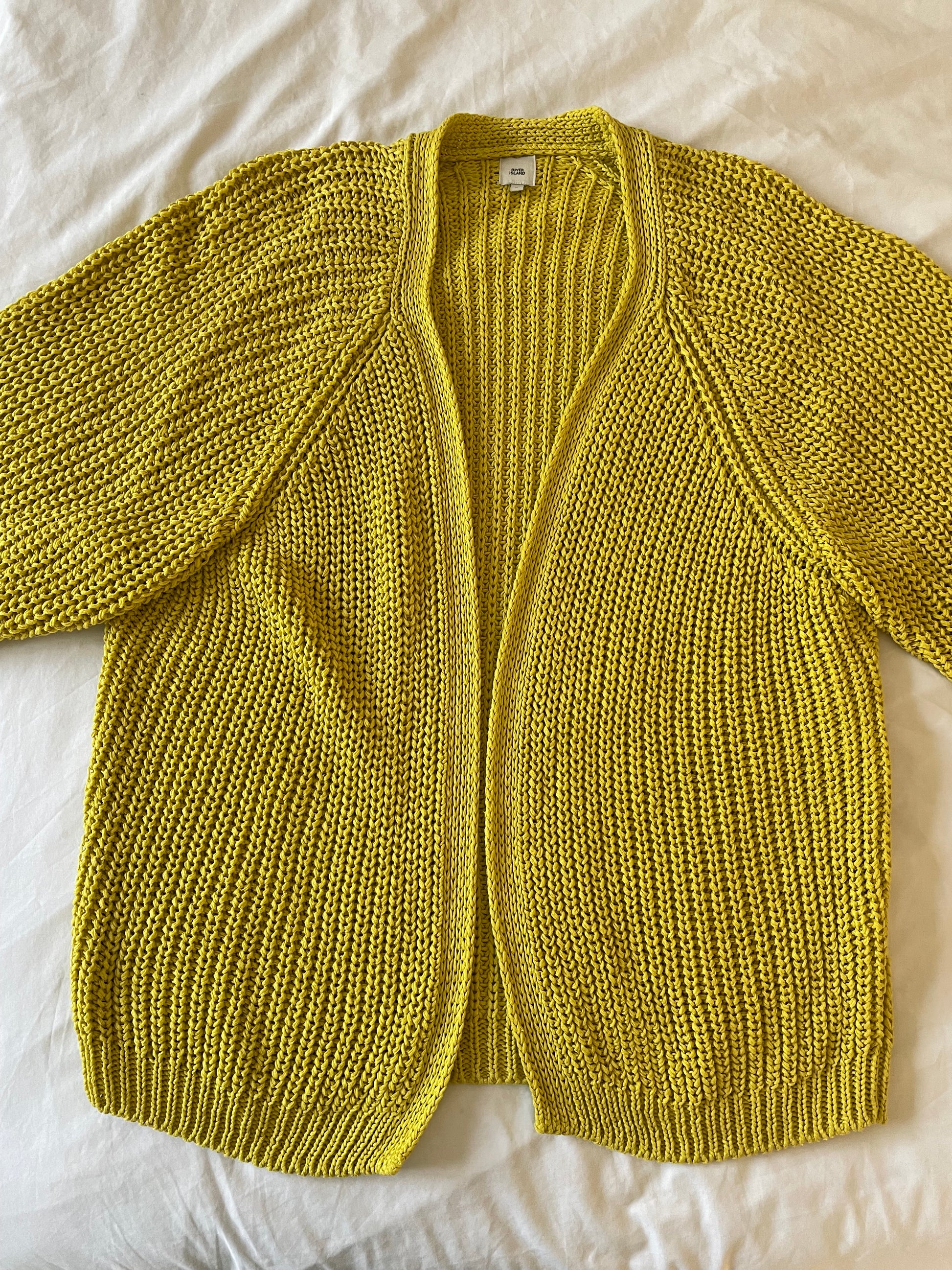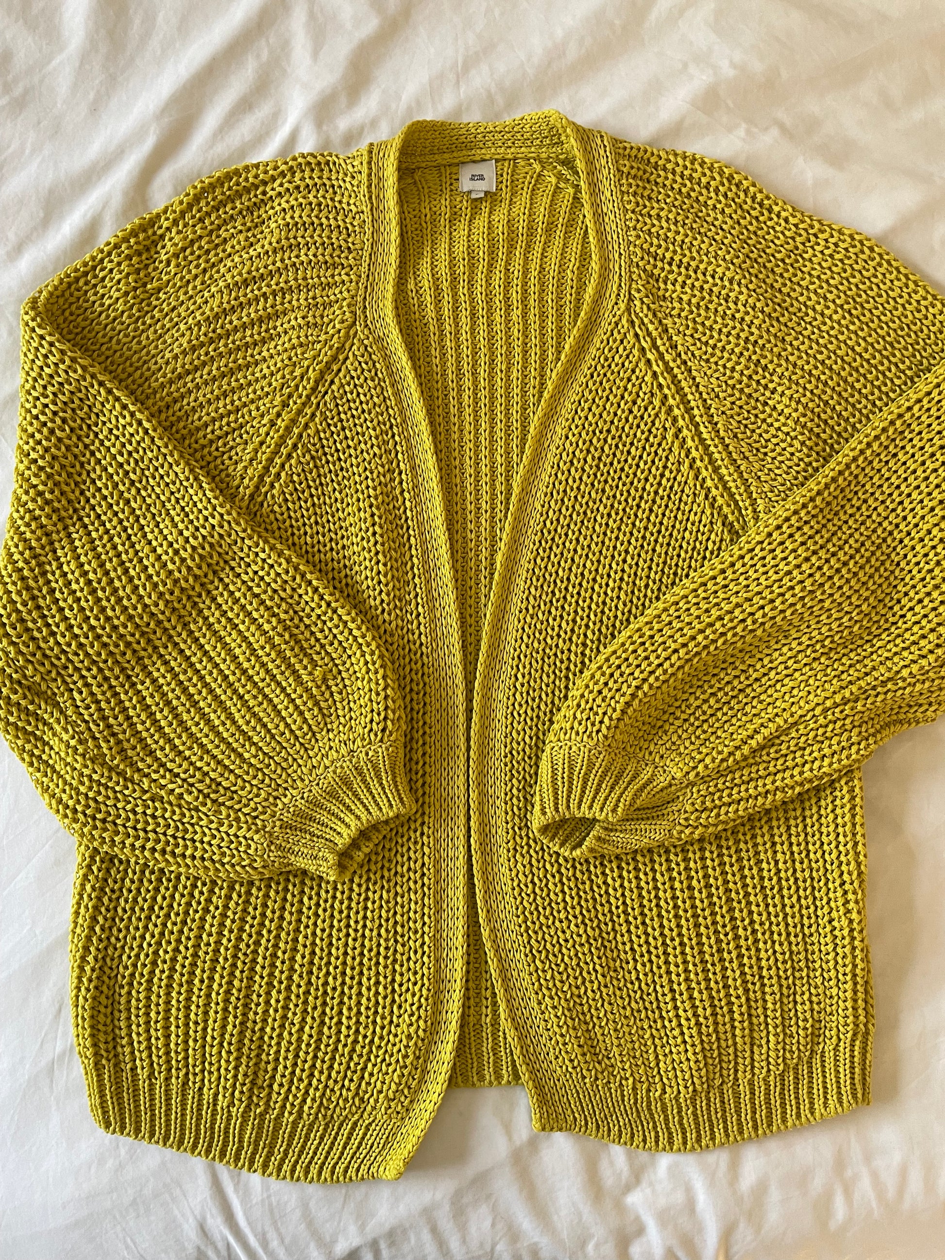 Yellow/green chunky cable knit open cardigan with balloon sleeves