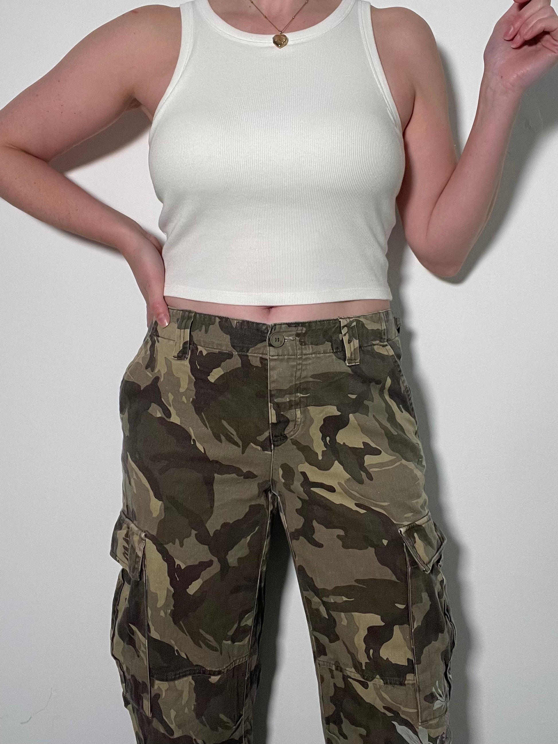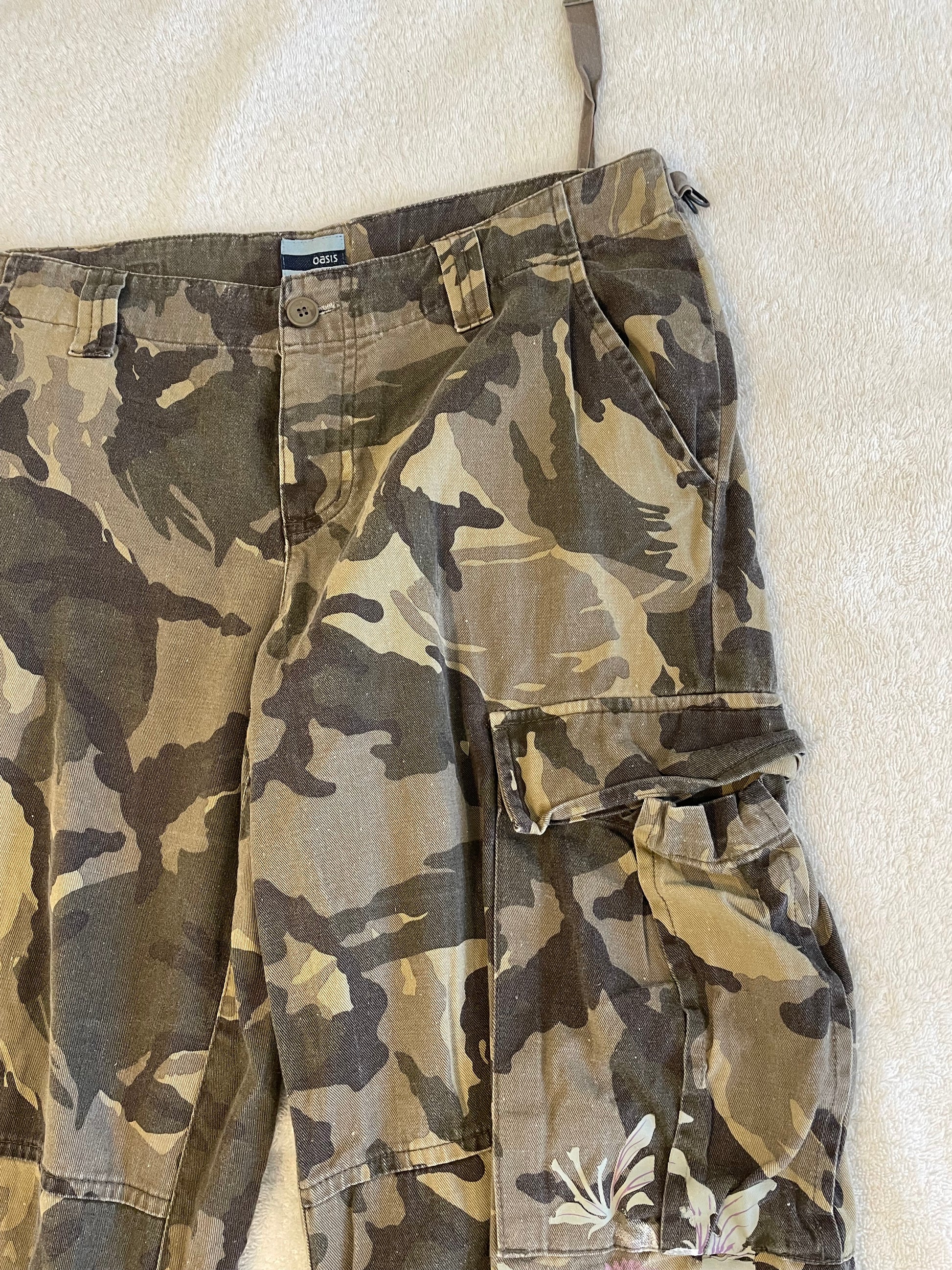 Green camo cargo trousers with floral pattern