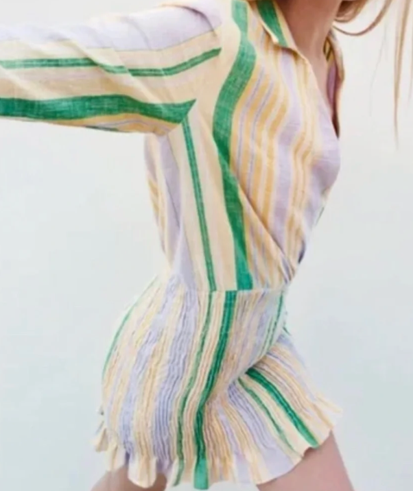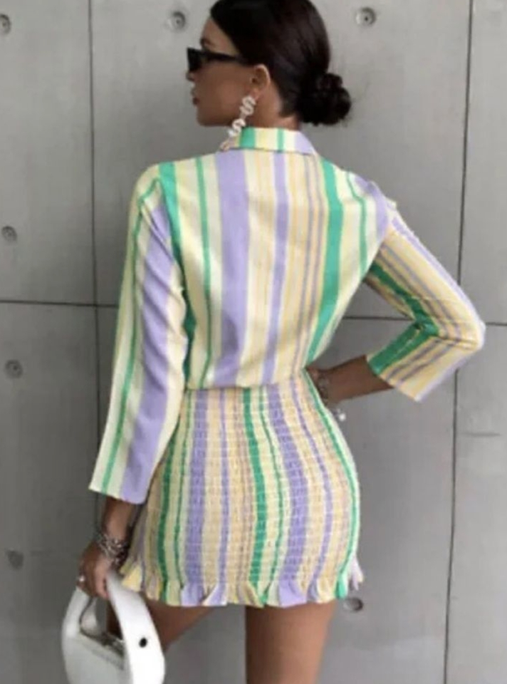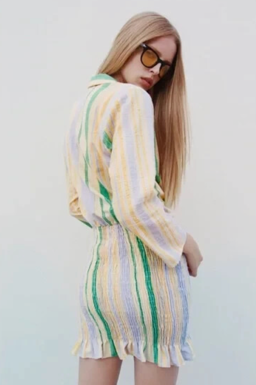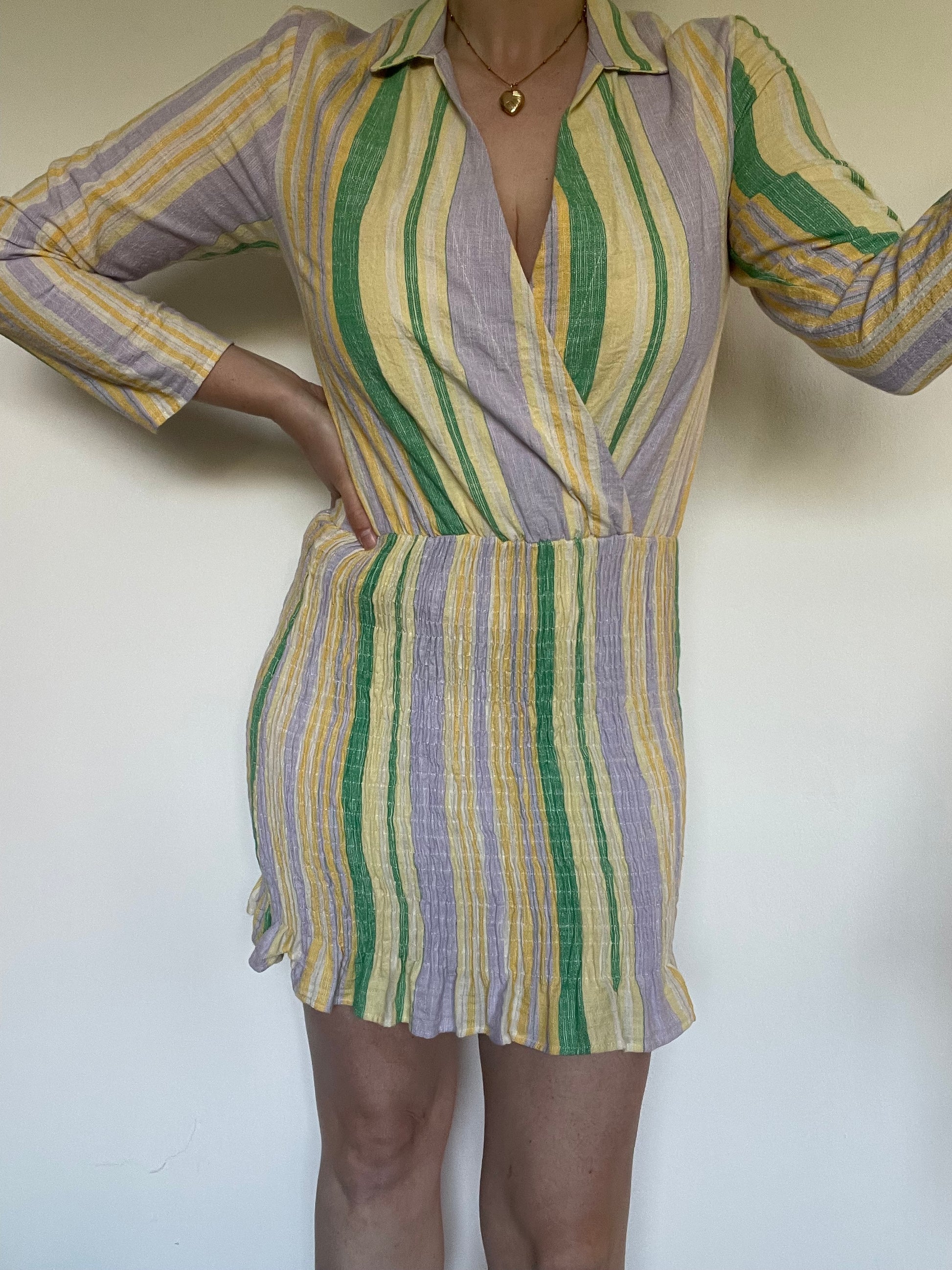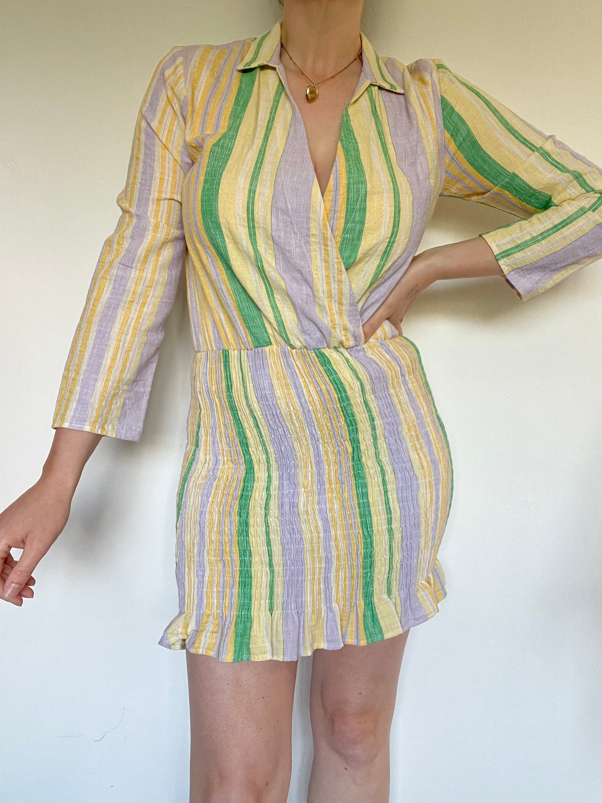 Zara Valery Dress, a pastel striped summer mini dress with a faux wrap front and ruffled hem